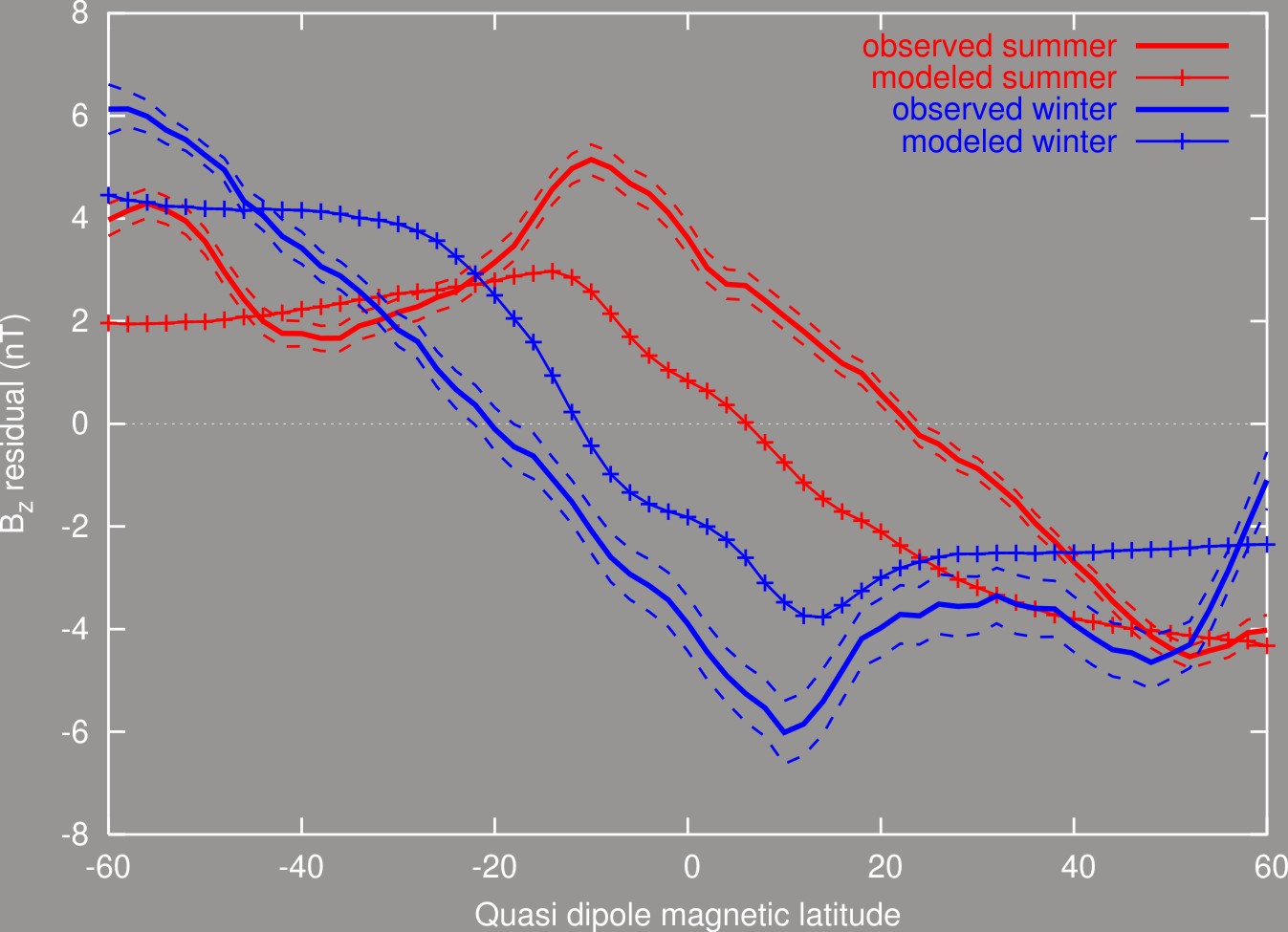 A further important driver of electric currents in the F-Region is the Earth’s gravity field. A gravity field acting on a collisionless, magnetized space plasma causes electrons and ions to drift into opposite directions, in addition to gyrating around the magnetic field lines. This sets up an electric current which flows perpendicular to the gravity and magnetic fields in the eastward direction. Its magnetic field signal, although 10,000 times smaller than the ambient Earth's magnetic field, is clearly visible in CHAMP satellite magnetic measurements (Maus and Luehr, 2006). A current ribbon of more than 50 kA, about 66 degrees wide in latitude moves with the sun northward in summer and southward in winter (see Figure 2).