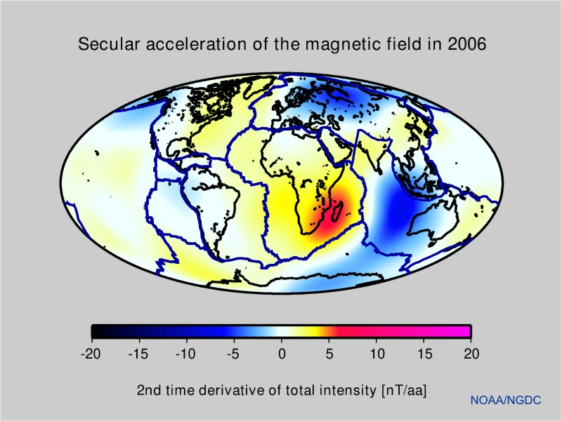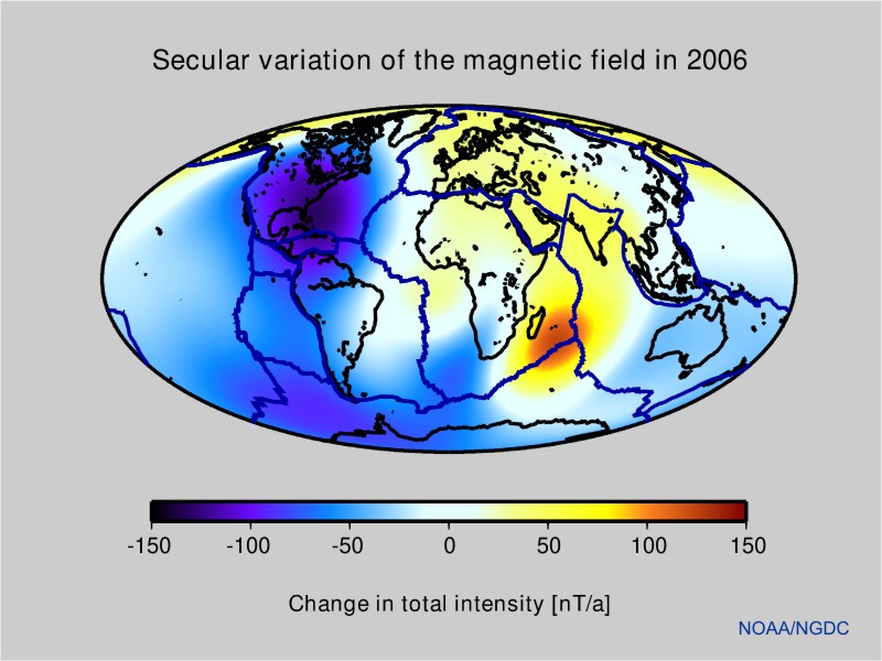 The main field changes slowly with a time scale of years. Accurate measurements of the magnetic field, provided by satellites and magnetic observatories, can be used to estimate the present changes in the field. The first time derivative is called the secular variation (Fig. 2). It shows that the field strength is decreasing in most parts of the World. The strongest decrease is seen the Caribbean. But there are also areas of increasing field strength, such as in the Indian Ocean.