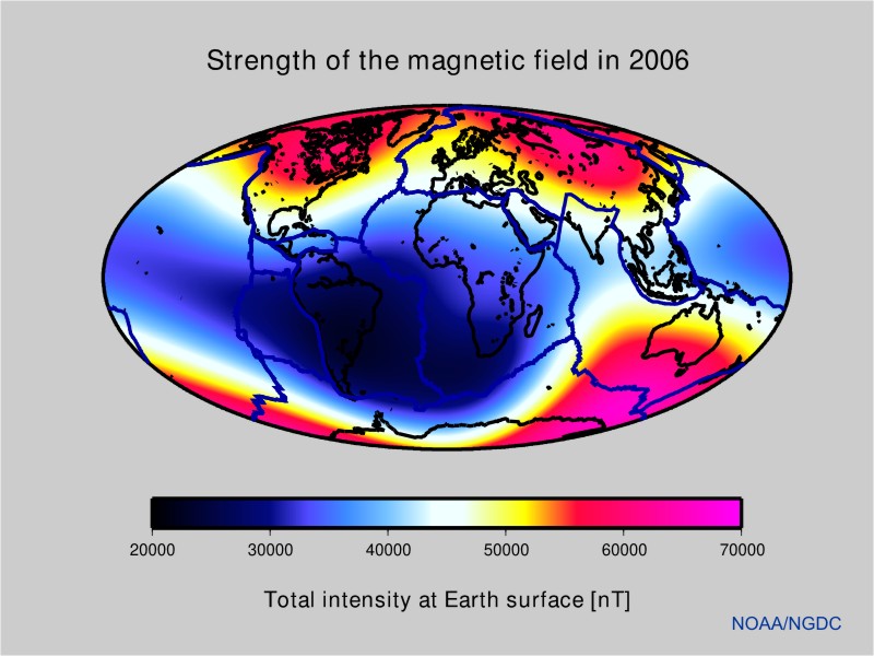 Fig. 1: Strength of the magnetic field at the Earth's surface in 2006, as given by the main field model POMME-3.0.
