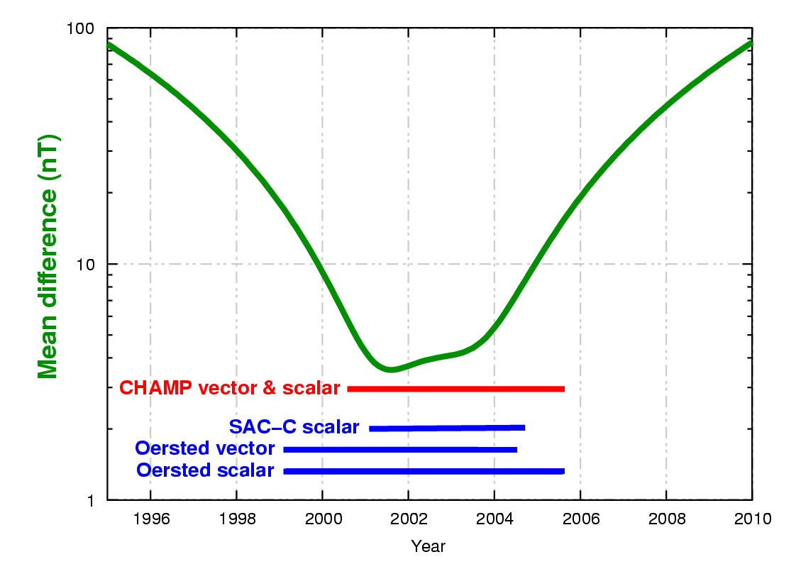 Fig.1: (click to enlarge) The accuracy of POMME-3 and its prediction for the future geomagnetic field were verified by estimating an independent model from a combined data set of Oersted and SAC-C satellite measurements. The difference in the core field representations of the models (spherical harmonic degrees 1-13) were then compared at the Earth's surface for the years 1995 to 2010. In the center of the modeling period, the mean amplitude of the difference-vector is around 4 nT. The disagreement between the models increases to about 100 nT for the predicted field in 2010. This may be seen as a realistic estimate of the uncertainty in the core field representation of POMME-3. |