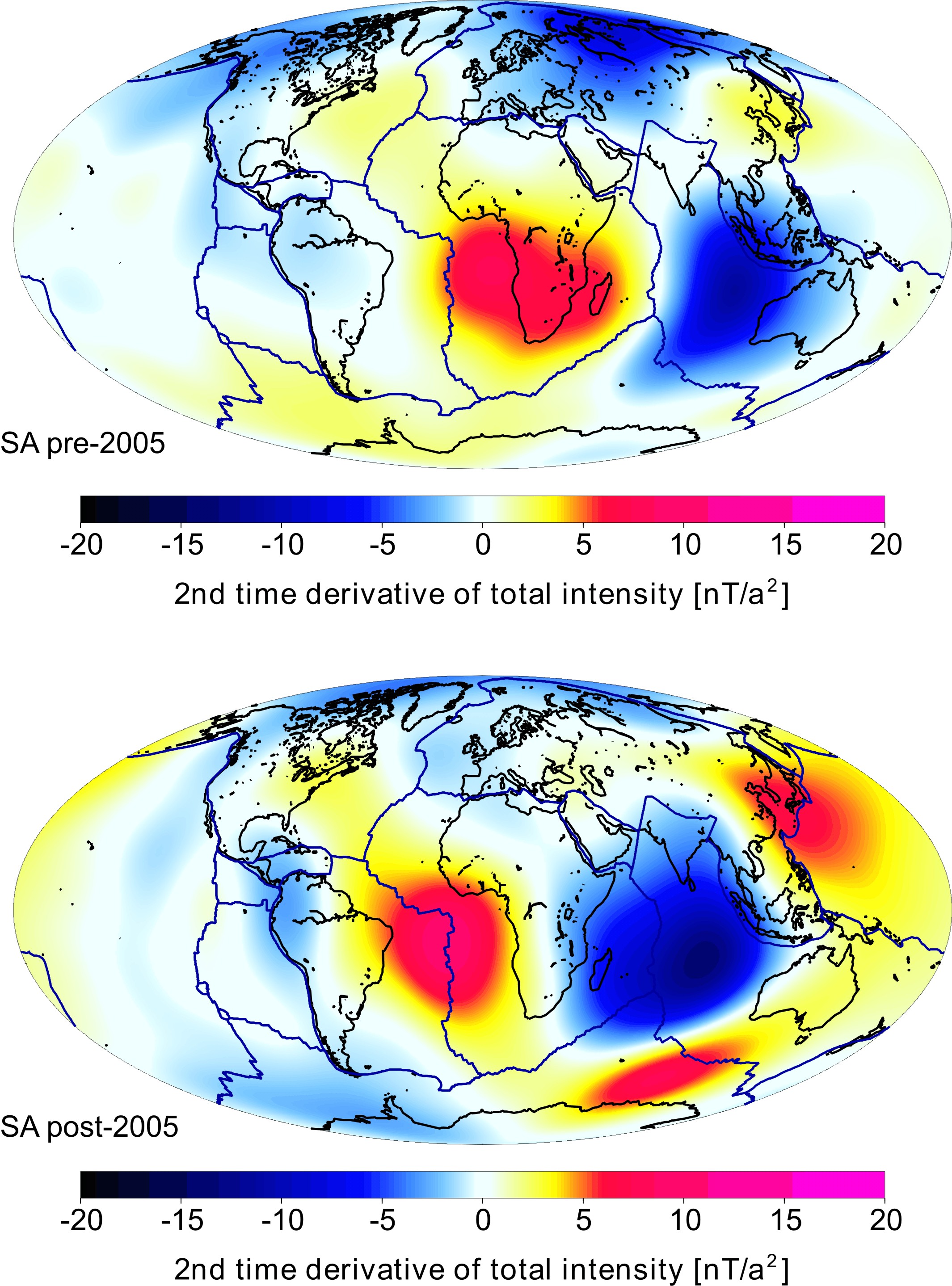 Fig.1: (click to enlarge) Geomagnetic power spectrum of the POMME-5 spherical harmonic coefficients in the definition of Maus (2008). Fig.2: (click to enlarge) Secular acceleration before 2005.0 (top) and after 2005.0 (bottom) as given by the POMME-5 model. |