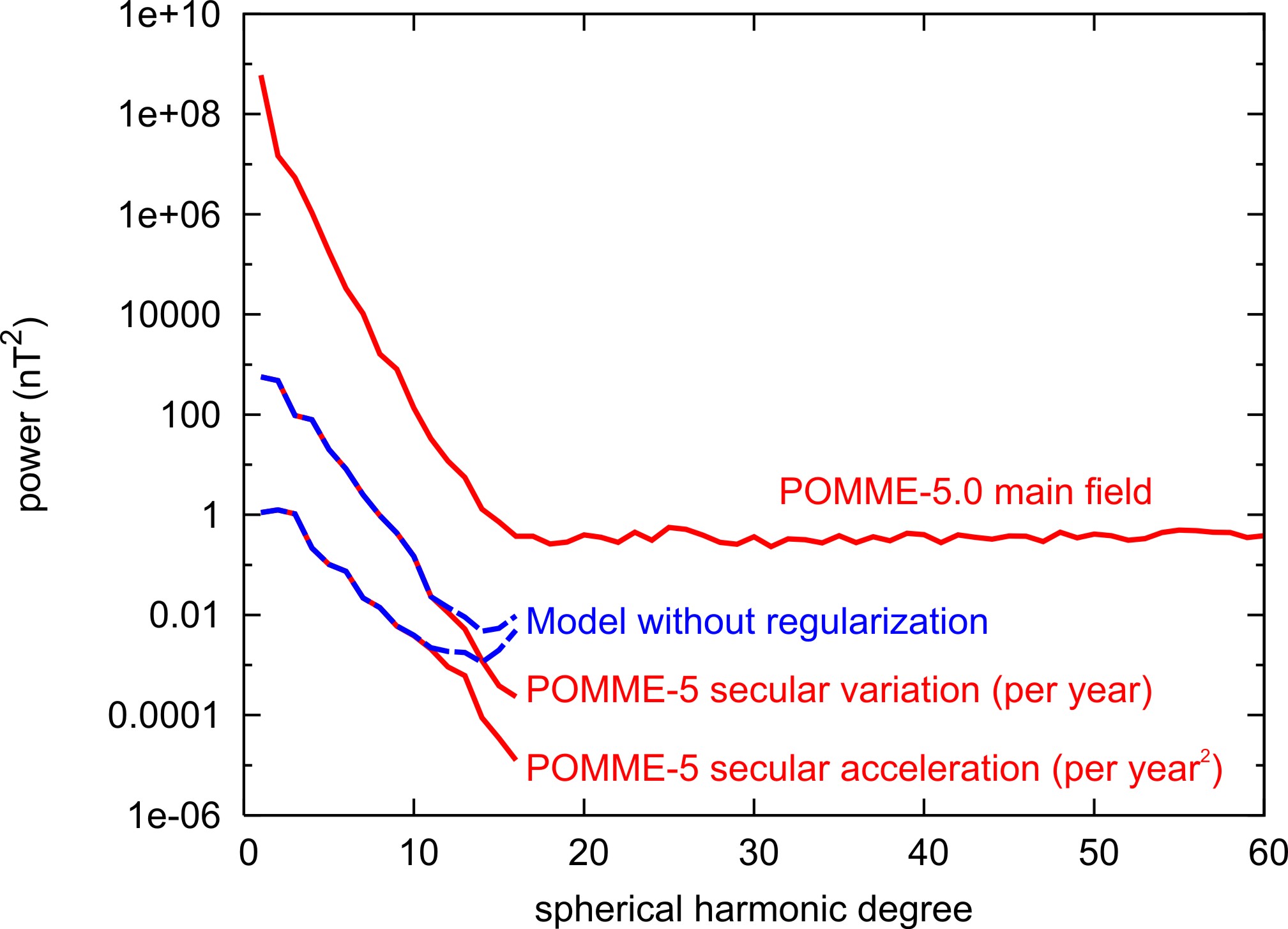 POMME is a main field model providing the geomagnetic field in the region from the Earth's surface to an altitude of a couple of thousand kilometers. The time variations of the field are represented by a Taylor series of the spherical harmonic (Gauss) coefficients of the magnetic potential. We provide the static coefficients for 2005.0 and the first and second time derivatives (secular variation and secular acceleration). The corresponding geomagnetic power spectrum is shown in Figure 1. The red curves show the actual spectra of the model, while the blue curves show the resulting spectra if no regularization (damping) were applied in the model estimation. The upward trend of the blue spectra above degree 13 indicates that the POMME-5 secular variation and acceleration coefficients are reliably determined to at least degree and order 12. As in POMME-4, we have split the secular acceleration into pre-2005 and post-2005 values. This is equivalent to a Taylor series expansion at 2005.0 using a different 2nd time derivative before and after 2005. Plots of the secular acceleration before and after 2005.0 are given in Figure 2. It can be seen that the curvature of the geomagnetic field variation, given by the secular acceleration, changes quite dramatically over the model period. POMME-5 includes the time varying core field, crustal field to degree 60, the ring current field modulated by the Dst/Est/Ist Indices, a time averaged magnetospheric field, the penetration of the horizontal part of the Interplanetary magnetic field (IMF), and the fields induced by Earth rotation in the external fields. To evaluate the model for a given location and time, the user has to provide the Est/Ist-index , which the model requires in order to track the magnetospheric disturbance field. See Est/Ist index page at NOAA. In addition, the Y component of the Interplanetary Magnetic Field (IMF) has to be supplied. In case these quantities are unknown (e.g. when the field is evaluated for a future date), then Est, Ist and IMF-By should be set to zero. The parametrization of POMME-5 is very similar to the one of POMME-3. The main features are
